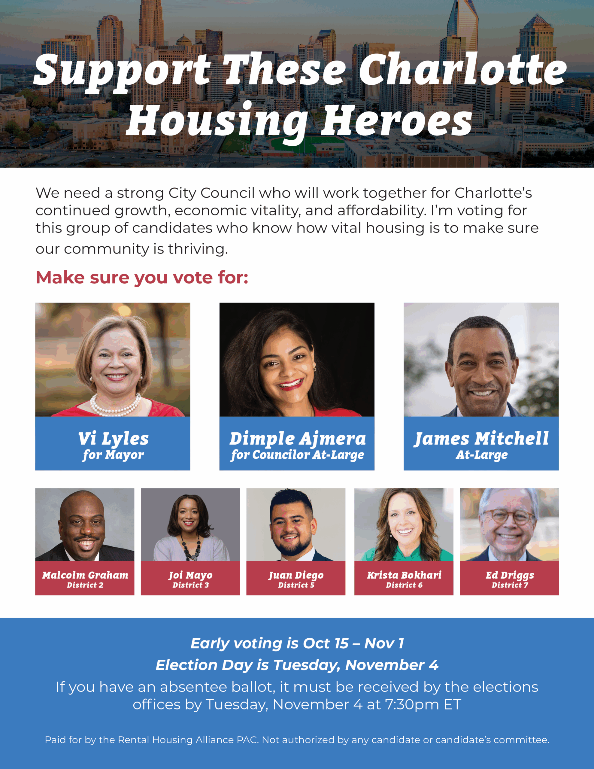 We need a strong City Council who will work together for Charlotte’s continued growth, economic vitality, and affordability. I’m voting for this group of candidates who know how vital housing is to make sure our community is thriving.